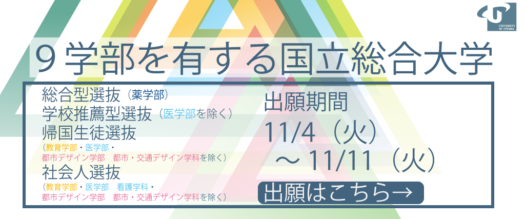 富山大学では、大規模な災害発生に伴う被害に対して、被災者の経済的負担を軽減し、受験者の進学機会の確保を図るため、入学検定料の免除制度があります。