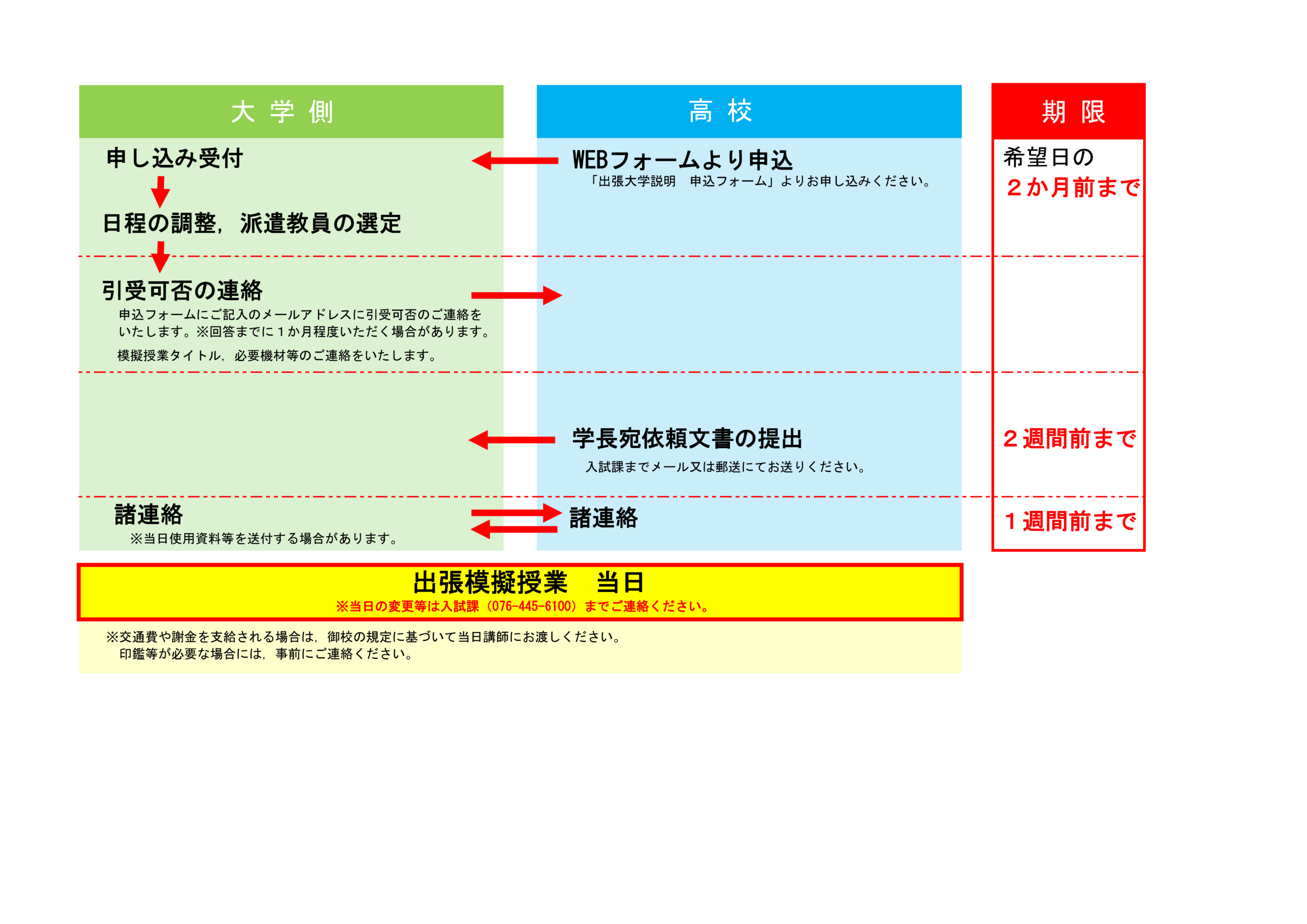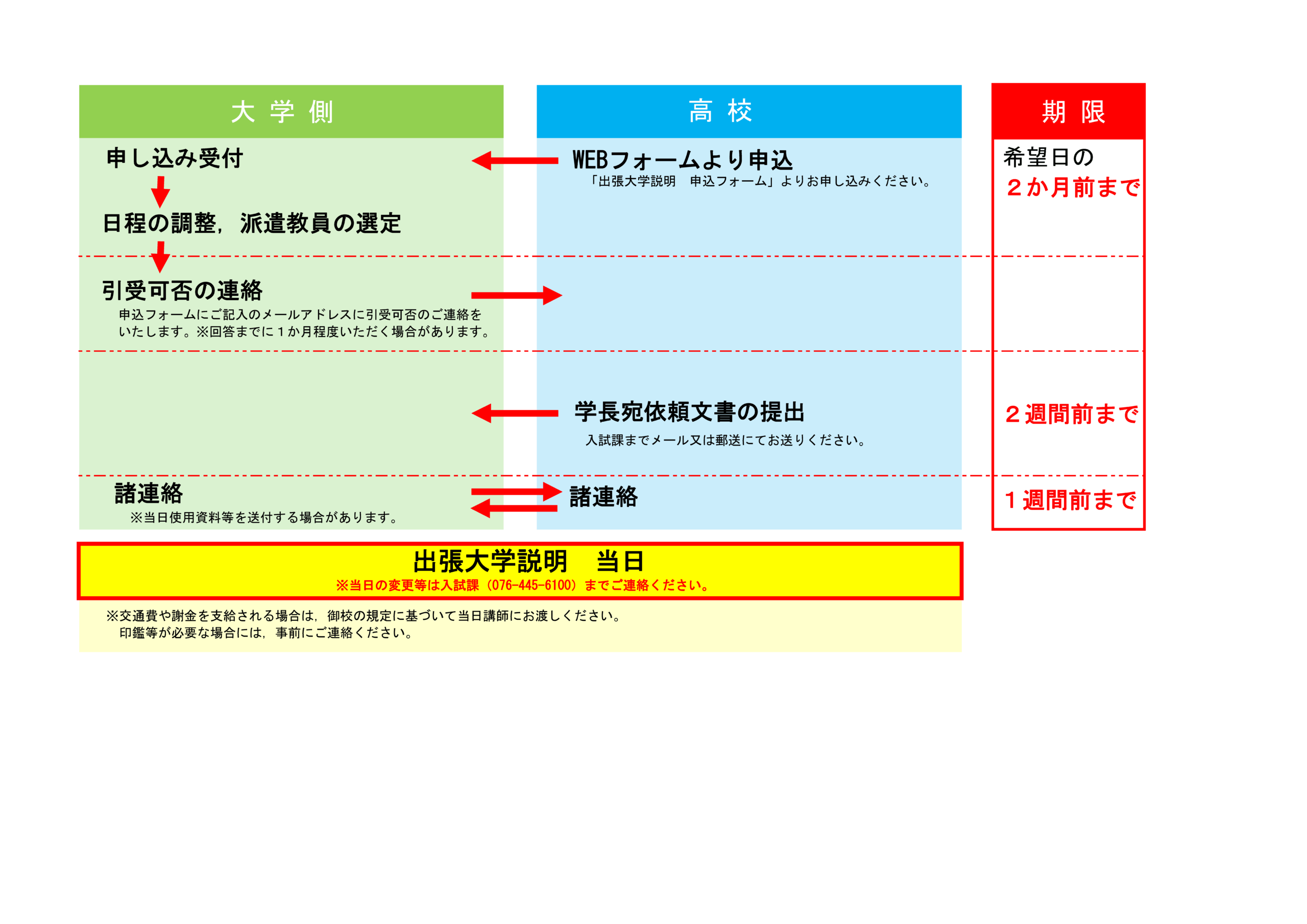 以下の「出張大学説明の申し込みから実施までの流れ」を参考にしてください。