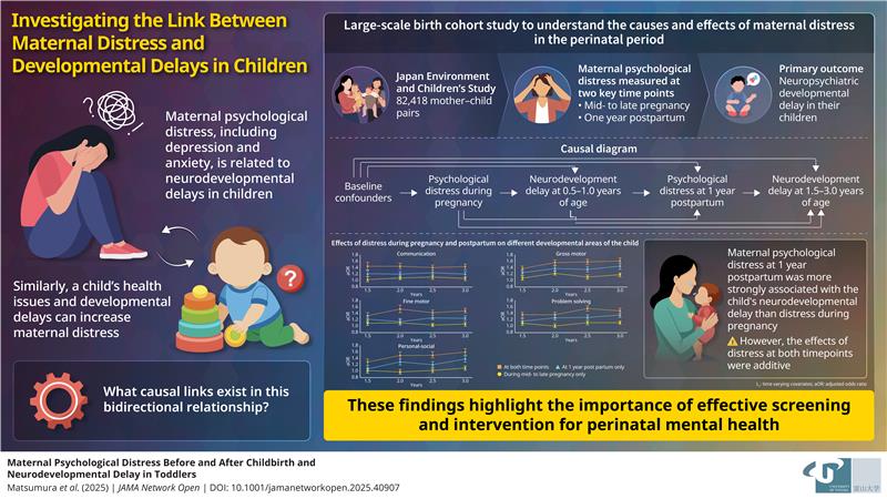 Brain development during the initial years is critical, shaped by both environment and caregiver behaviors. To clarify the causal relationship between maternal psychological distress and neuropsychiatric developmental delays, researchers in Japan analyzed data from over 82,000 mother–child pairs in a large-scale nationwide cohort. They found that distress within 1 year postpartum had stronger effects on the toddler’s neurodevelopment than prenatal distress, emphasizing the importance of continuous maternal mental health support before and after childbirth.