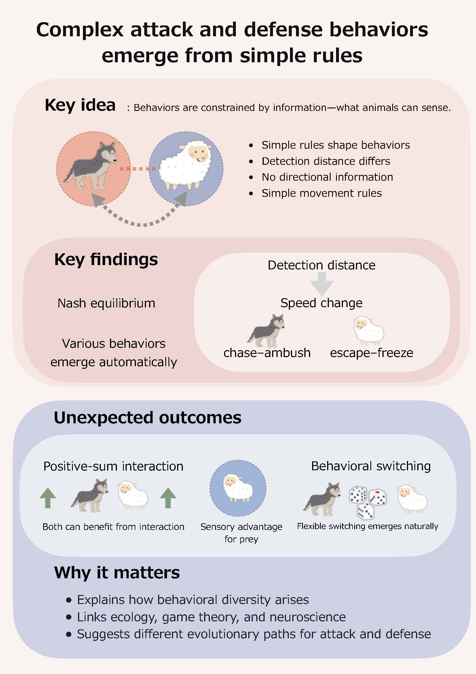 - Image caption:Researchers used computational simulations to demonstrate how simple sensing and movement rules—such as detection of distance and speed changes—constrain predator–prey interactions. In a simplified model, detection alone (without directional information) triggers movement responses, producing chasing, ambush, escape, or freezing behaviors. Varying sensory ranges and movement rules lead to predictable, stable attack and defense strategies consistent with Nash equilibrium, while also allowing flexible behavioral switching and sensory advantages to emerge naturally.