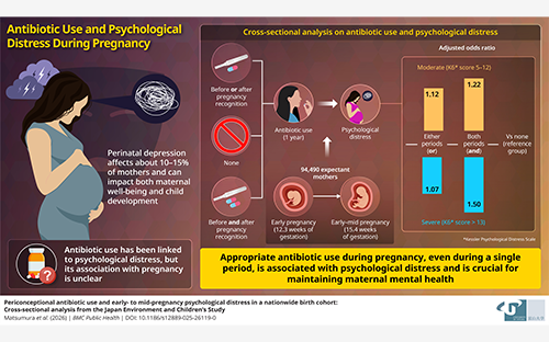 - Image title: Large-Scale Study Examines Antibiotic Use and Psychological Distress in Pregnancy Caption: Analysis of 94,490 pregnant women enrolled in the Japan Environment and Children’s Study shows that antibiotic use before and during pregnancy was associated with a higher likelihood of psychological distress during early- to mid-pregnancy.