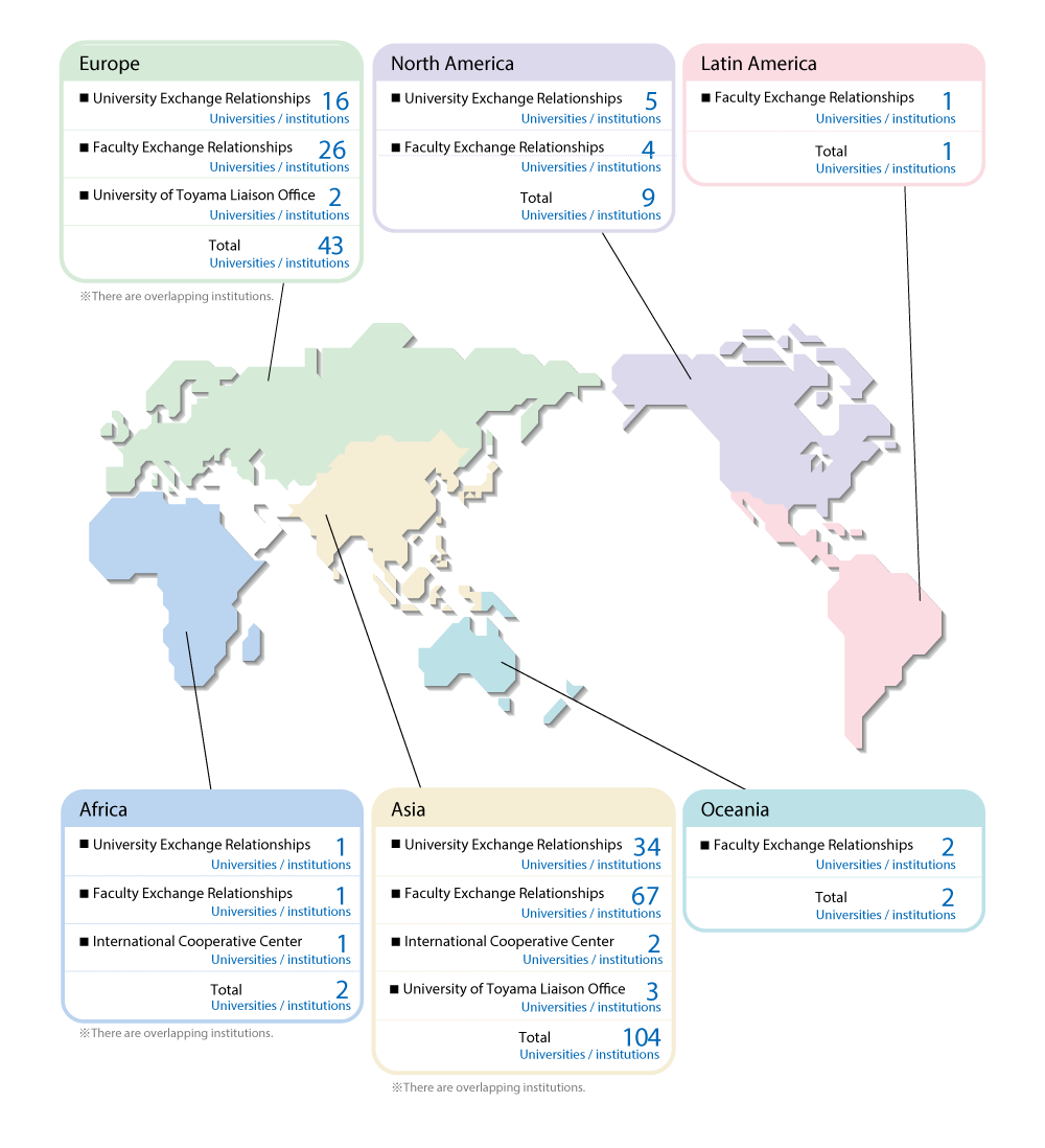 The University of Toyama has 56 exchange agreements with 56 institutions in 22 countries/regions.