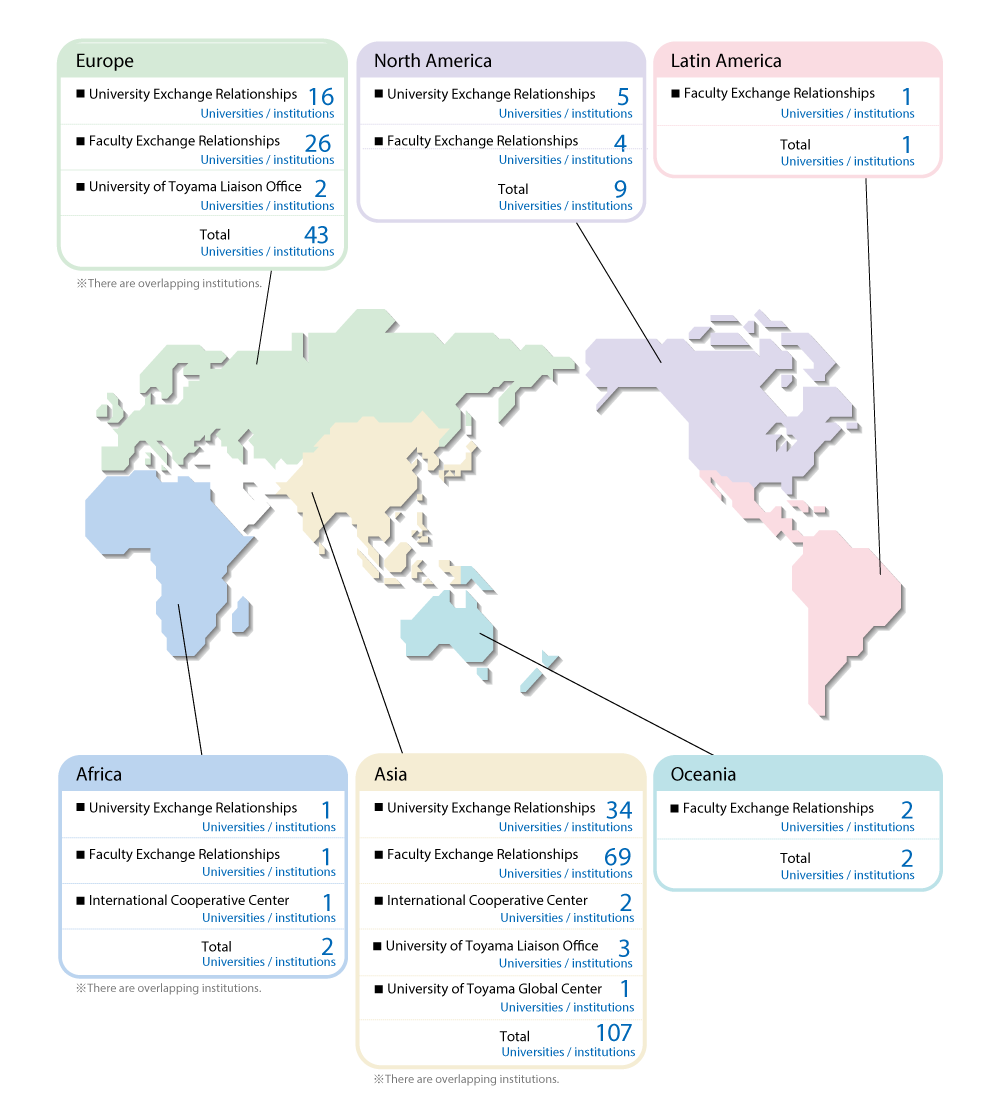 The University of Toyama has 56 exchange agreements with 56 institutions in 22 countries/regions.