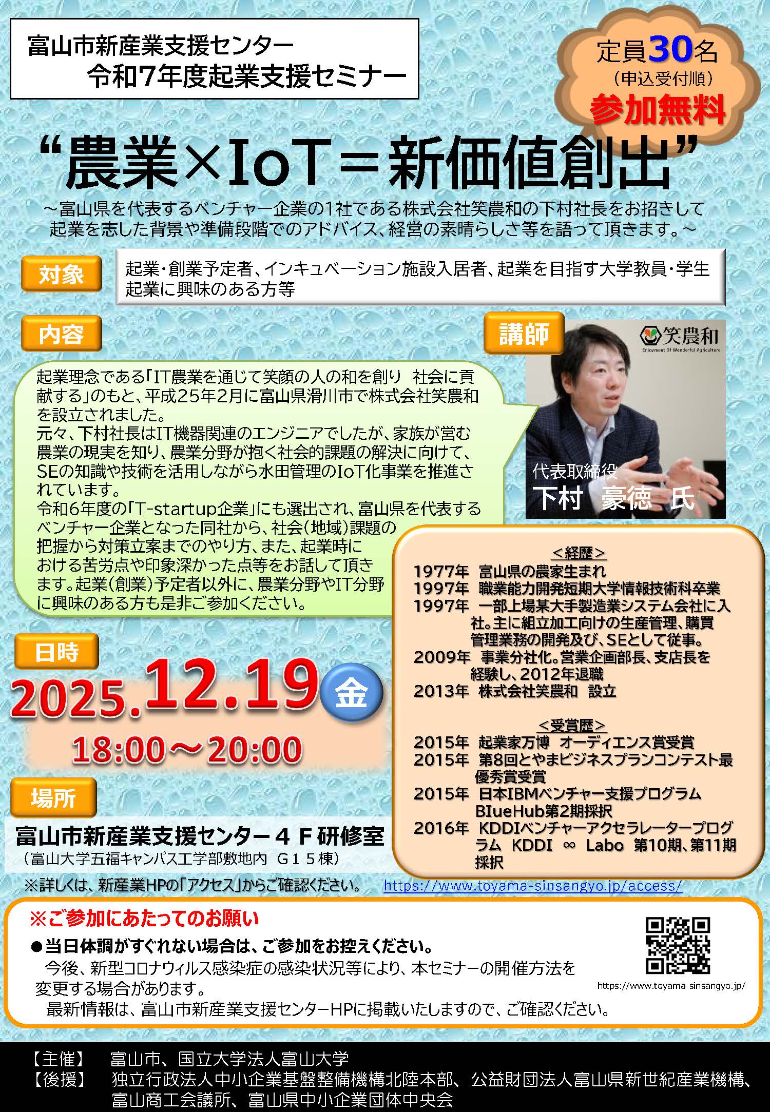 富山県を代表するベンチャー企業の一社である株式会社笑農和の代表取締役 下村豪徳氏をお招きして、起業を志した背景や準備段階でのアドバイス、社会課題の把握から対策立案の進め方、また起業時における苦労点や印象深かった点等をお話しいただきます。
