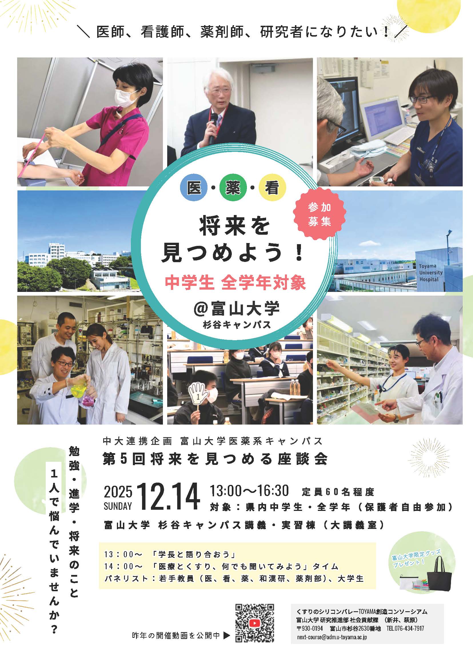 県内の中学生親子が、学長をはじめ、医学部(医学科、看護学科)、薬学部、和漢医薬学総合研究所の若手教員、附属病院薬剤部の若手薬剤師及び先輩学生から、人々の命を守る医療やくすりなどに関する話を聞き、自由に質問できる場を提供する。