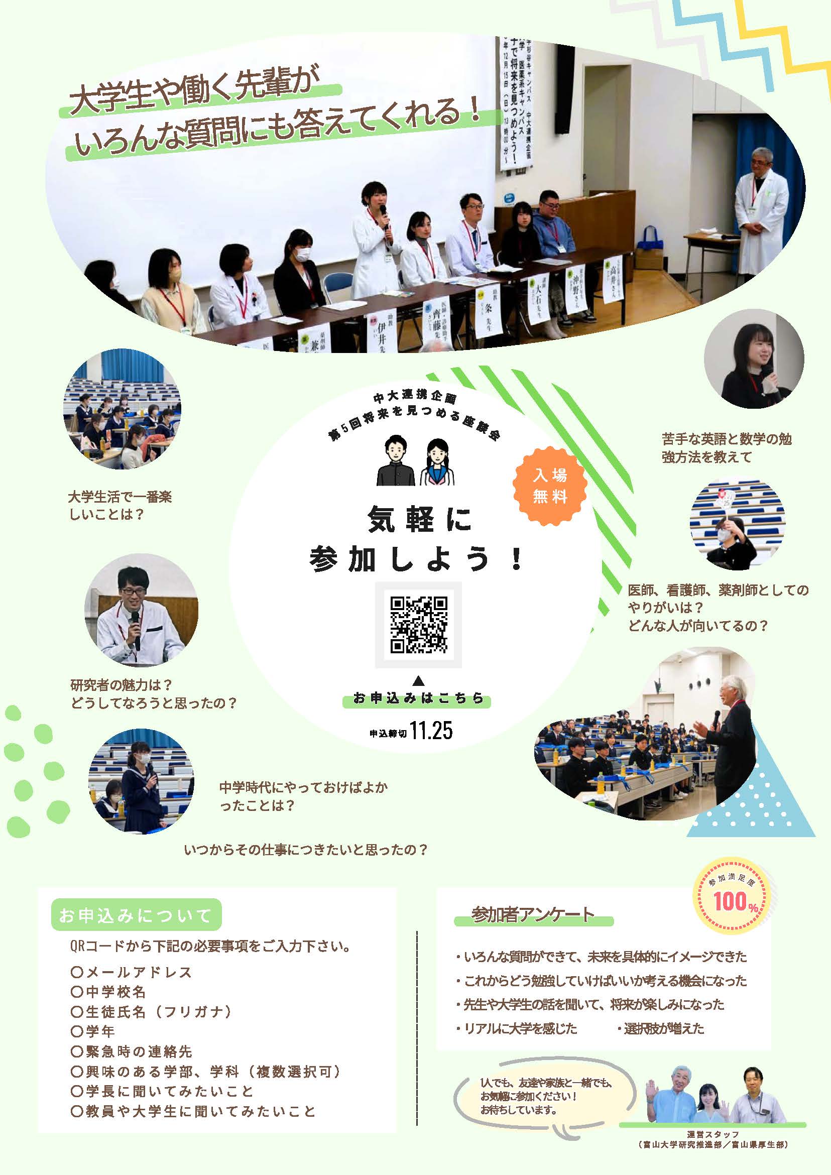 中学生には、学長ほか大学関係者に聞いてみたいと思う医学・薬学・看護学に関する質問事項を参加申込時に調査し、参加者のニーズに応えられる場とする。
