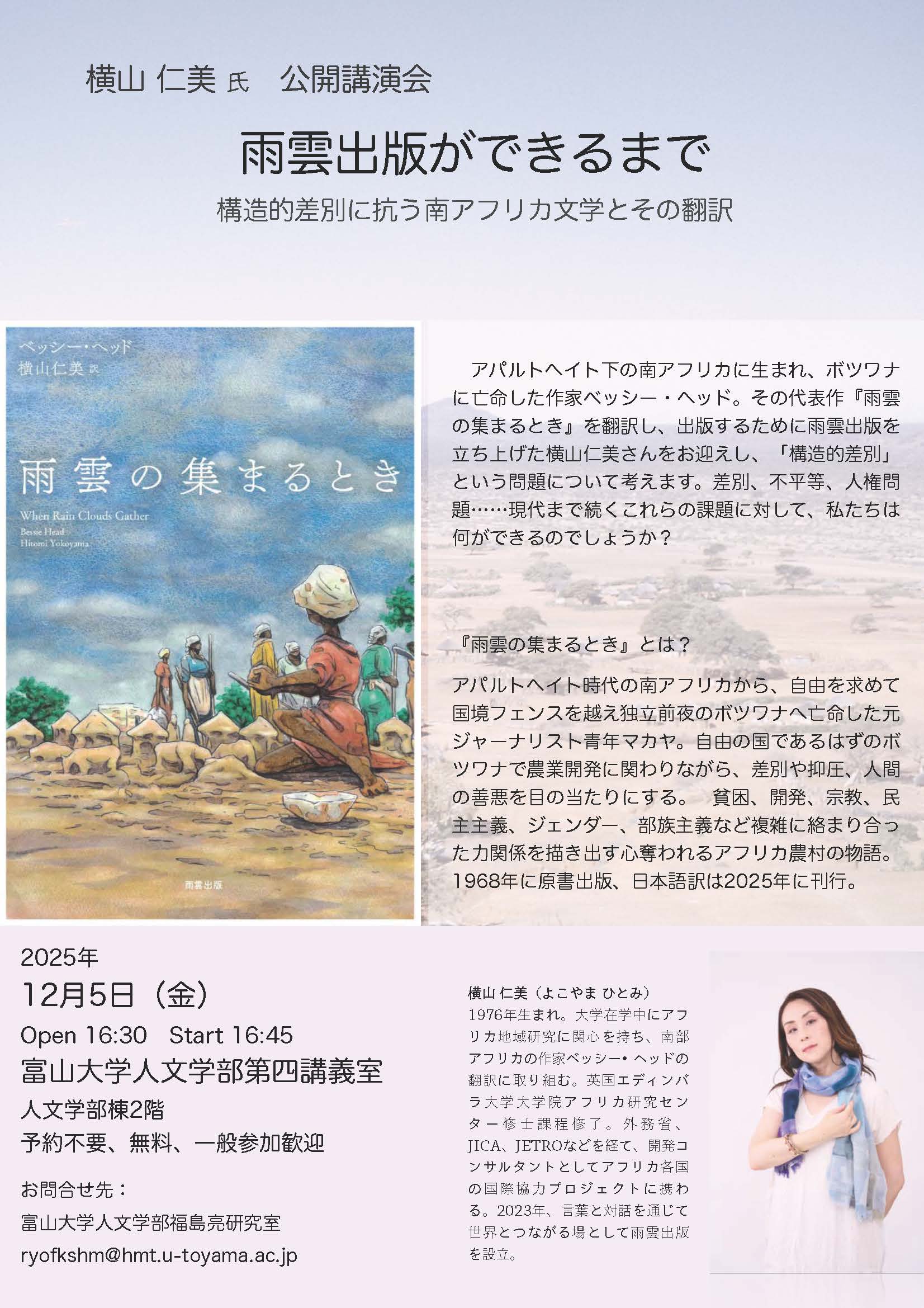 雨雲出版代表・横山仁美氏による公開講演会「雨雲出版ができるまで——構造的差別に抗う南アフリカ文学とその翻訳」が、富山大学人文学部で開催される。