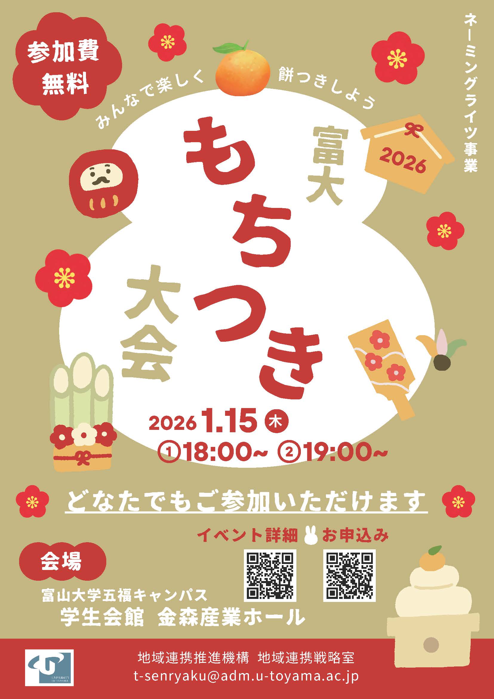 ネーミングライツ事業「国境、年齢、場を超えてつながる」の一環として、「富大もちつき大会」を開催します。
