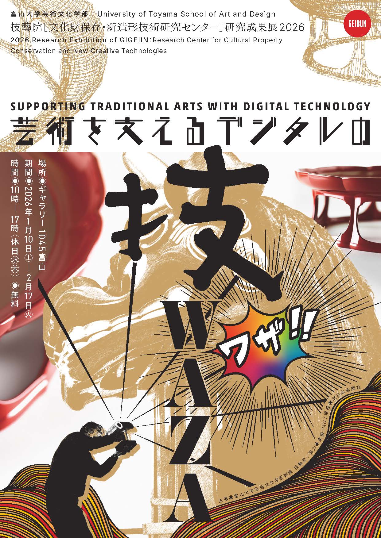 富山大学芸術文化学部附属 技藝院(文化財保存・新造形技術研究センター)は、令和2年(2020)に発足しました。文化財保存修復と新たな造形技術の創出という2大目標を掲げ、4つの部門「文化財保存部門」「建築文化部門」「デジタルミュージアム部門」「デジタルファブリケーション部門」が研究を行ってきました。伝統工芸とデジタル技術を融合させ、地域文化の継承と現代造形表現の発展のために活動しています。 設立から5年目を迎え、以下の日程でこれまでの研究成果を展示いたします。技藝院を地域の皆様に広く知っていただき、伝統工芸のさらなる発展を目指したいと考えています。