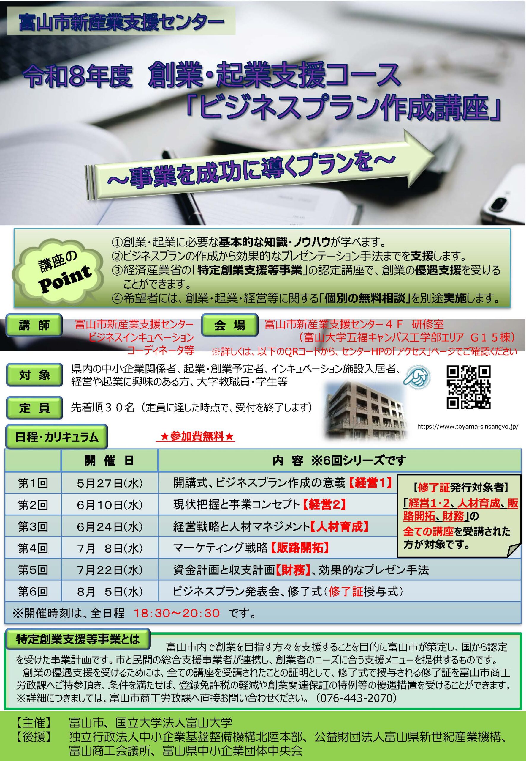 富山市創業支援事業計画の特定創業支援等事業に認定されている講座です。