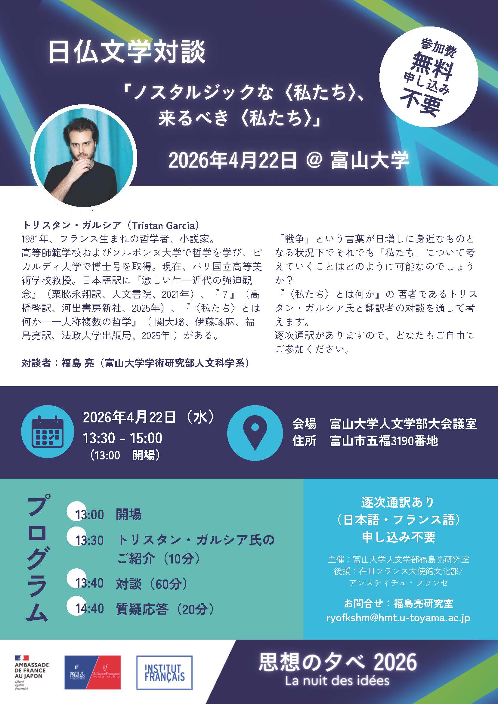 このたび、ガルシア氏を富山大学にお迎えし、〈私たち〉という主題をめぐって対談を行います。「戦争」という言葉がメディアを通じて日増しに身近なものとなりつつあります。このような「敵対性」の時代にあって、〈私たち〉という主語は過去のものとなってしまったのでしょうか。それとも、〈私たち〉という主語で思考することはやはり可能なのでしょうか。このようなアクチュアルな問いに対して、文学や芸術を切り口としつつ、語り合います。文学、思想、社会情勢一般に関心を持つ学生、教員、一般の方々の来場を歓迎します。なお、対談はフランス語で行いますが、逐次通訳があるため、どなたでも参加することができます。