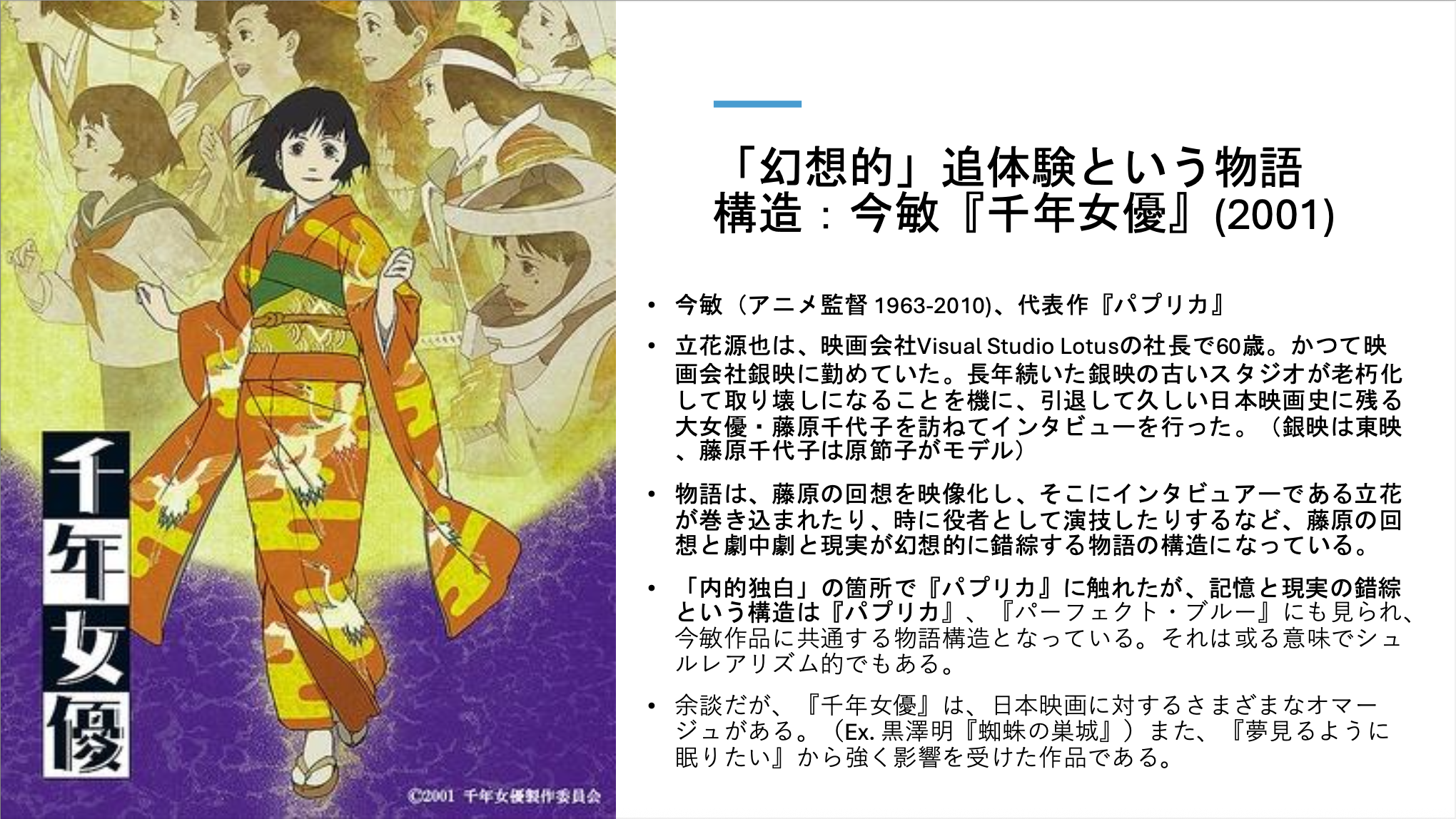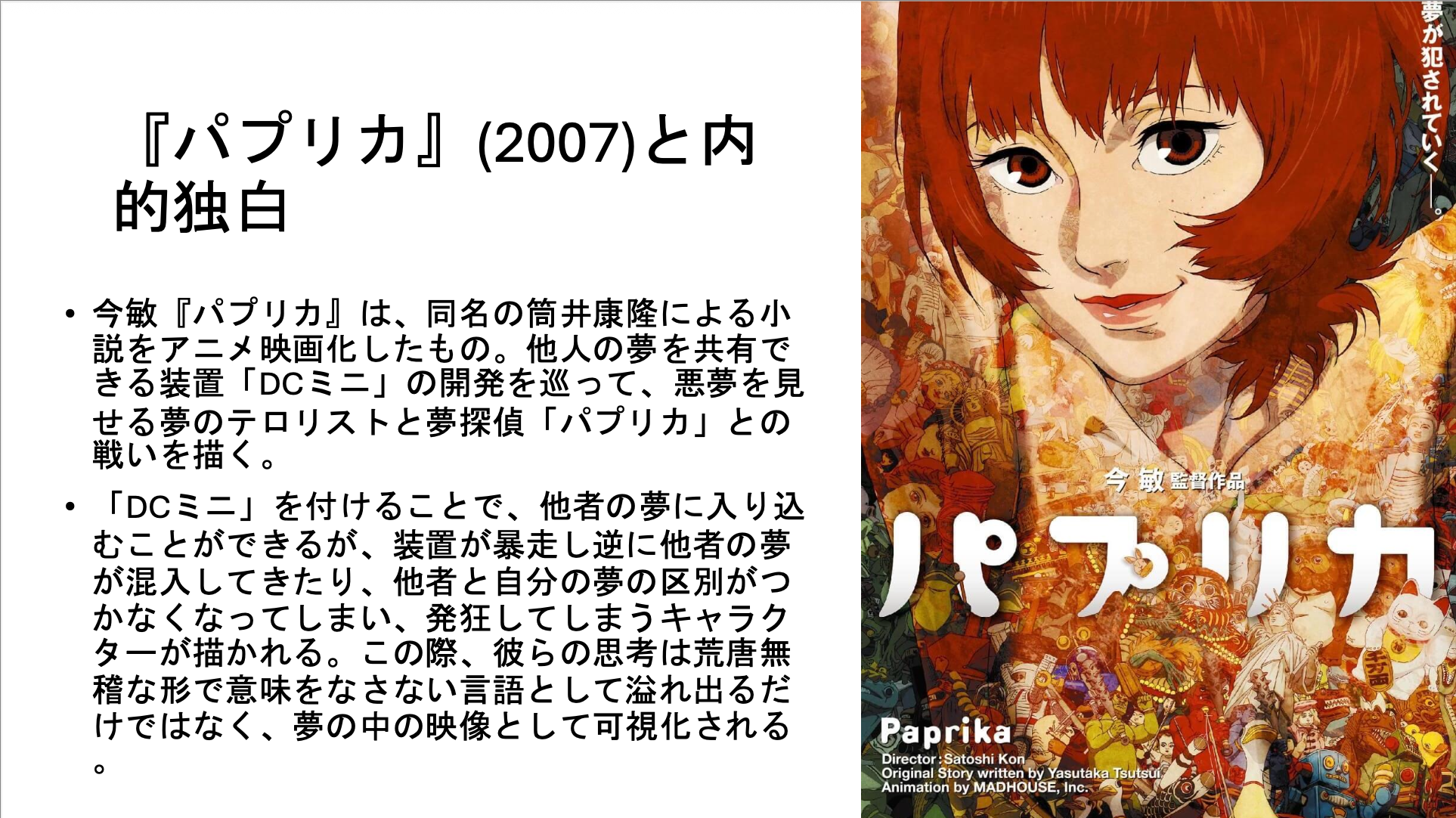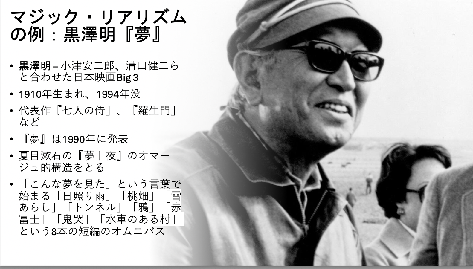 「精読」するといっていますが、授業で取り扱う作品は、多岐にわたっています。それは、「精読」のためのトピックが、小説以外のメディアー映画、アニメ、漫画、絵画などーにおいても応用可能だからです。また講義名に「アメリカ」と講義に名前がついていますが、この授業ではそうした国籍の枠組みにとらわれず、様々な国の作品を扱います。そういうわけで、これまでこの授業で扱った作品は、例えば『白鯨』、『マンスフィールド・パーク』、『ロリータ』、『メメント』、『ダーク・ナイト』、『ファンタスティック・プラネット』、『アリス』、『ファイトクラブ』、『華麗なるギャッツビー』、『1984』、『スター・ウォーズ』、『フレンチ・ディスパッチ』『羅生門』、『夢』、『東京物語』、『イリアの空UFOの夏』、『恋空』、『電車男』、『君の膵臓をたべたい』、『ドラえもん』、『パプリカ』、『ジョジョの奇妙な冒険』、『H2』、『となりのトトロ』、『魔法少女まどか☆マギカ』、『新世紀エヴァンゲリオン』、『君の名は』、『アイドルマスター』、シュルレアリスムの絵画など多岐にわたっています。