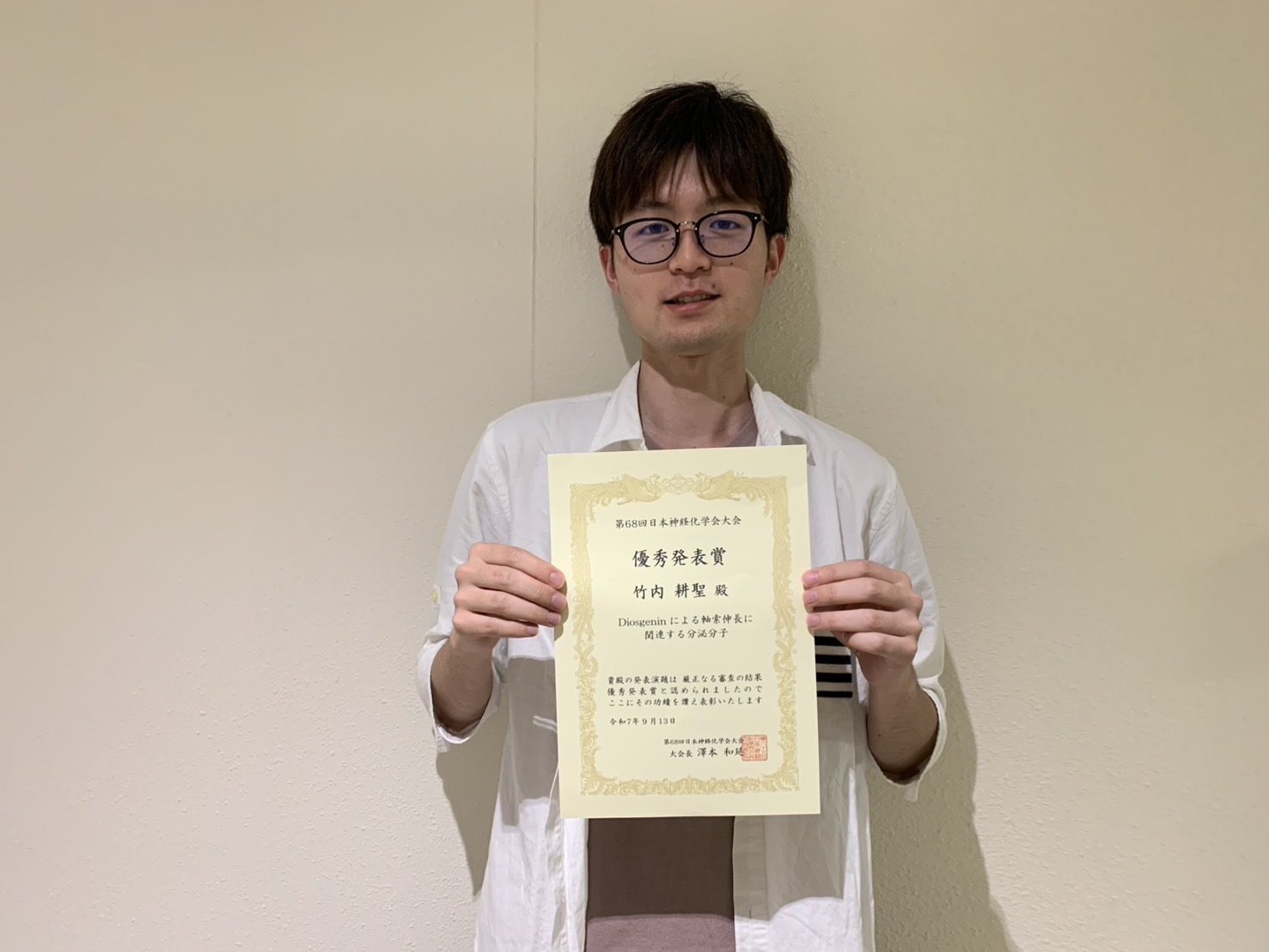 2025年9月11日(木)~13日(土)に名古屋で行われた第68回日本神経化学会大会において、和漢医薬学総合研究所 神経機能学領域の竹内 耕聖さん(工学部4年生)が優秀発表賞 (ポスター学生枠) を受賞しました。