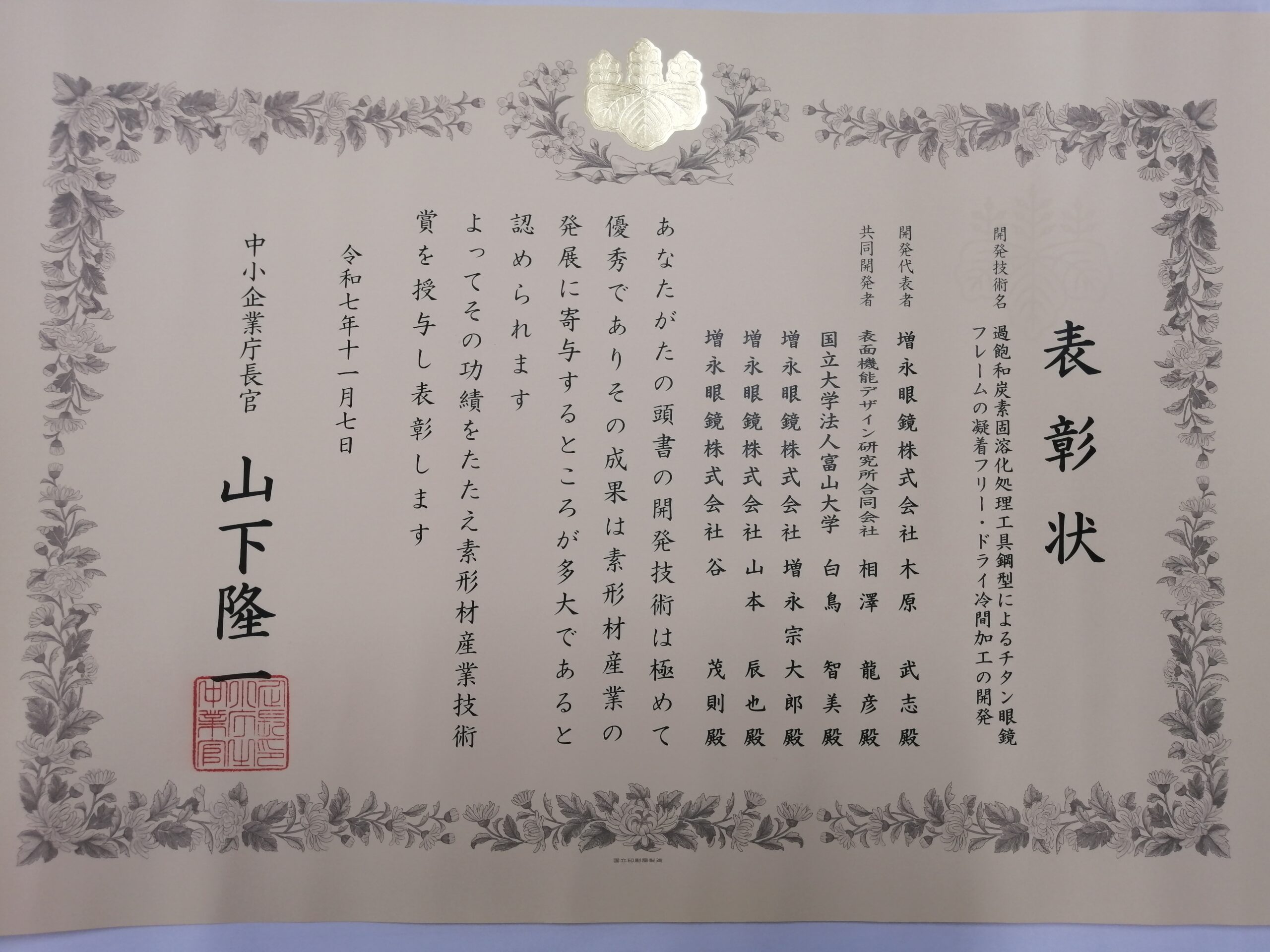 本受賞は眼鏡フレームに用いるチタン材料の成形方法に関係しています。