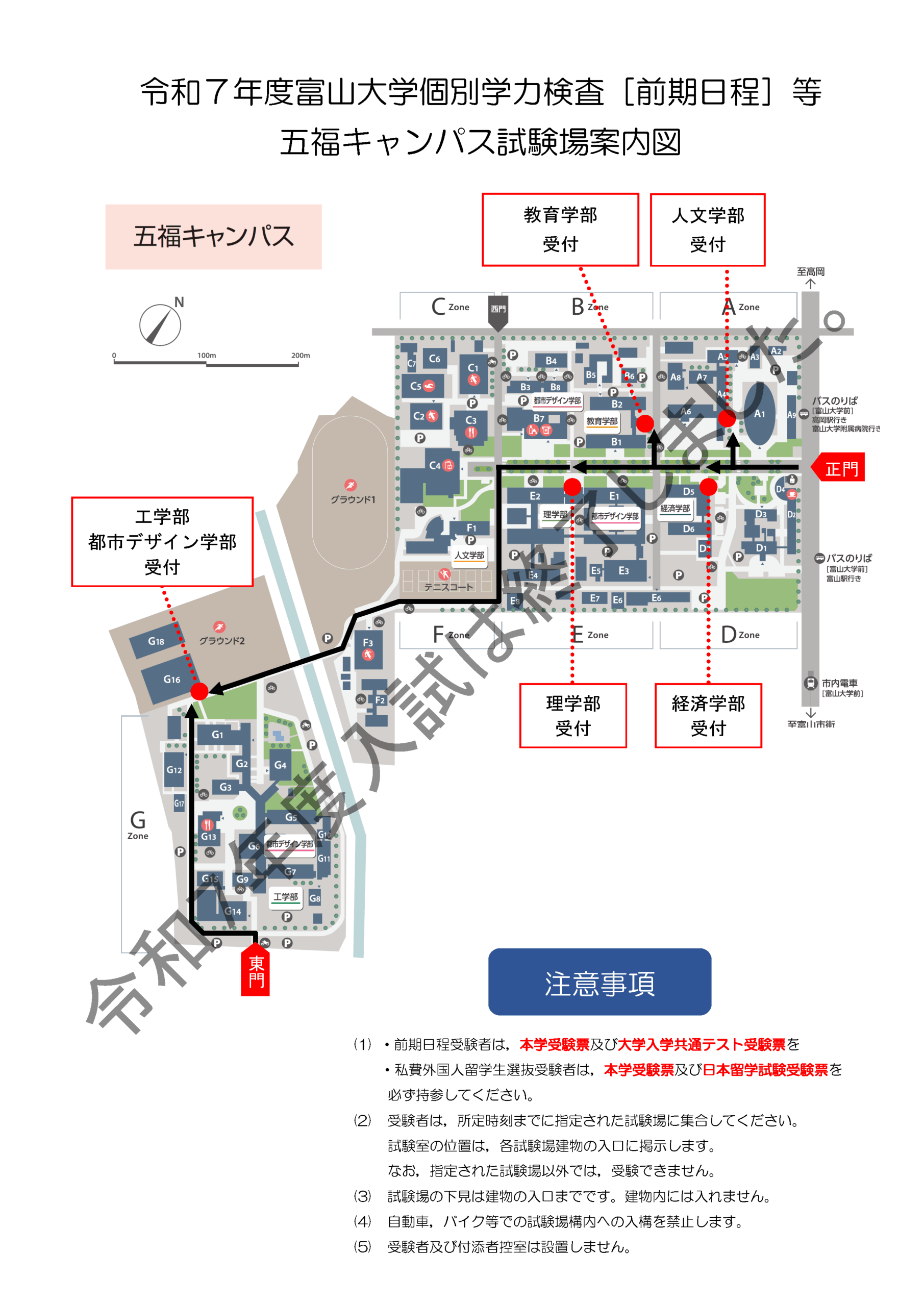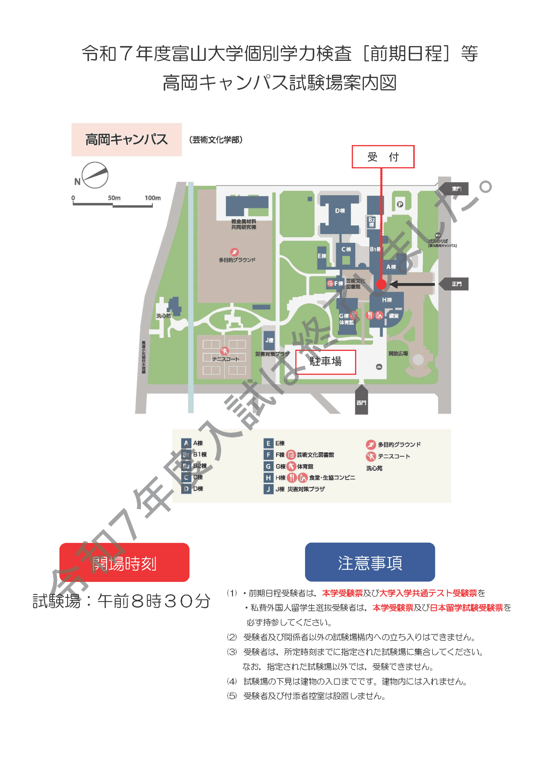 - 試験場となる建物への2月25日(火)の入場開始時刻は、五福キャンパス試験場及び名古屋試験場は午前9時00分、杉谷キャンパス試験場及び高岡キャンパス試験場は午前8時30分です。