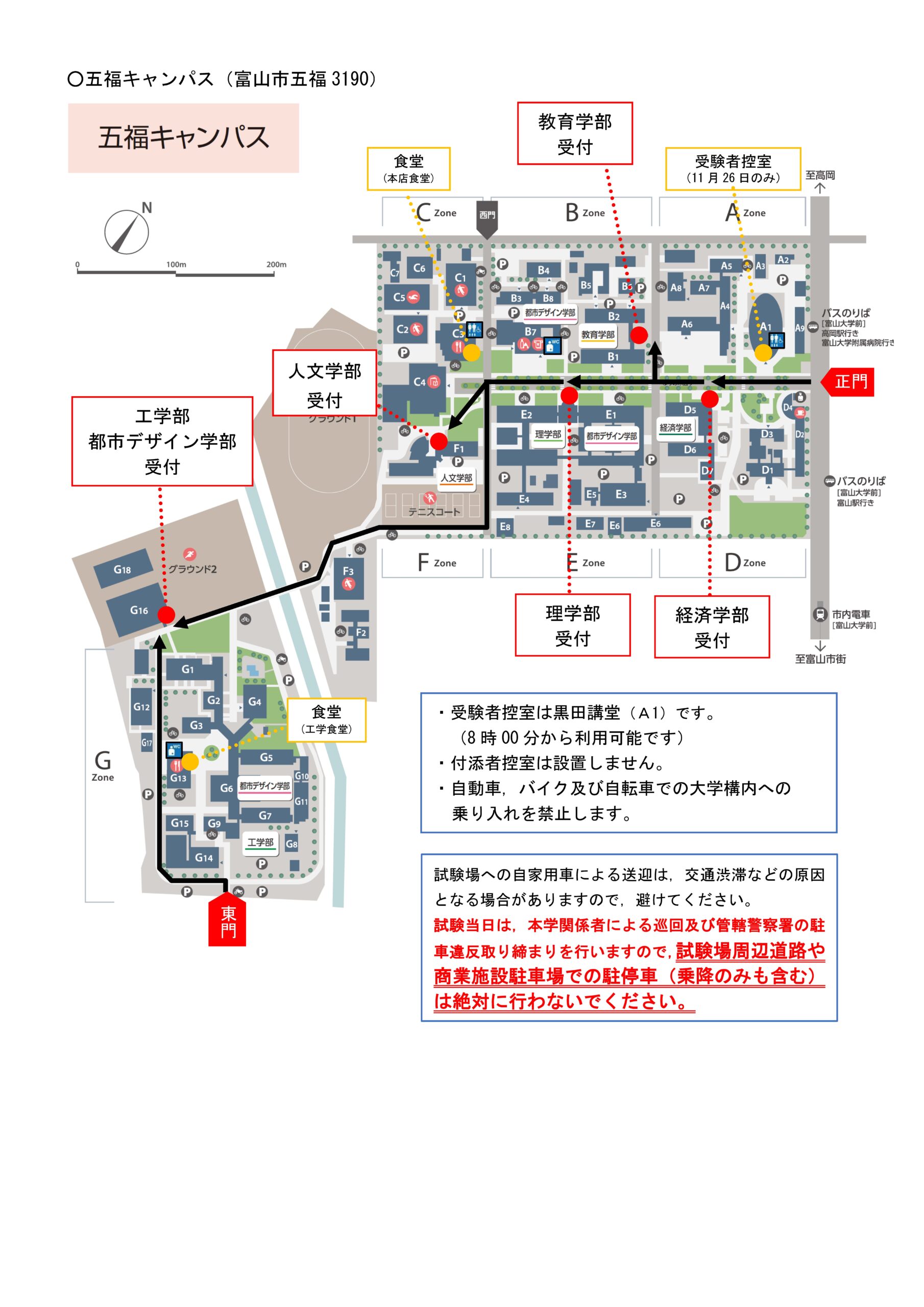 - 試験当日はなるべく公共交通機関を利用すること。なお,五福キャンパスにおいては,自動車,バイク及び自転車での大学構内への乗り入れを禁止する。