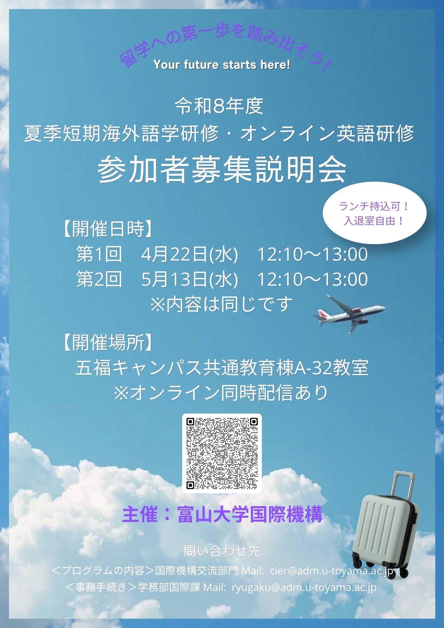 さらに詳しい情報が知りたい方は国際課留学支援担当(共通教育棟B棟1階)までお越しいただくか、メールにてお問合せください。