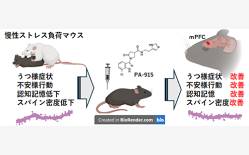 - うつ病の動物モデルマウスにおいて、PAC1受容体遮断薬PA-915が単回投与で、即効性かつ持続的な抗うつ作用、抗不安作用、認知記憶を改善することを発見。