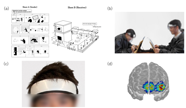 脳の活動にともなう血液中の酸素変化を、赤外線の一種(近赤外光)でとらえる装置。装着者への負担が少なく、自然な状態でコミュニケーションをとっている最中の脳活動を計測できるため、社会的なインタラクションの研究に広く用いられている。