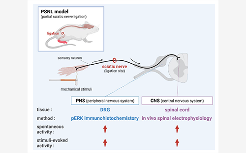 富山大学学術研究部薬学・和漢系 応用薬理学研究室の歌大介准教授、塩野義製薬株式会社の山根拓也研究員らの研究グループは、神経障害性疼痛モデルとして広く用いられる部分坐骨神経結紮(PSNL)モデルにおいて、末梢(後根神経節:DRG)と脊髄(脊髄後角)のニューロン活動を、in vivoにて系統的に評価しました。その結果、PSNLモデルでは、DRGの神経活動(pERK陽性細胞の増加)と脊髄後角ニューロンの発火頻度増加(刺激誘発・自発)とが同じ機械刺激条件で並行して高まり、両者が連動することが示されました。これにより、末梢神経活動の亢進が脊髄の神経過敏化を引き起こすという神経障害性疼痛の重要な機構が、in vivoのデータとして裏付けられました。