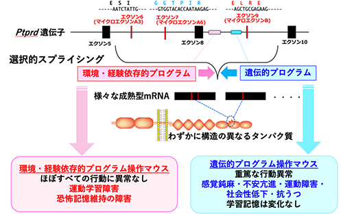 - 同じPtprd遺伝子のマイクロエクソンの環境依存的な選択的スプライシングプログラムを操作したマウスはある種の学習と記憶のみに異常が出ることを発見しました。