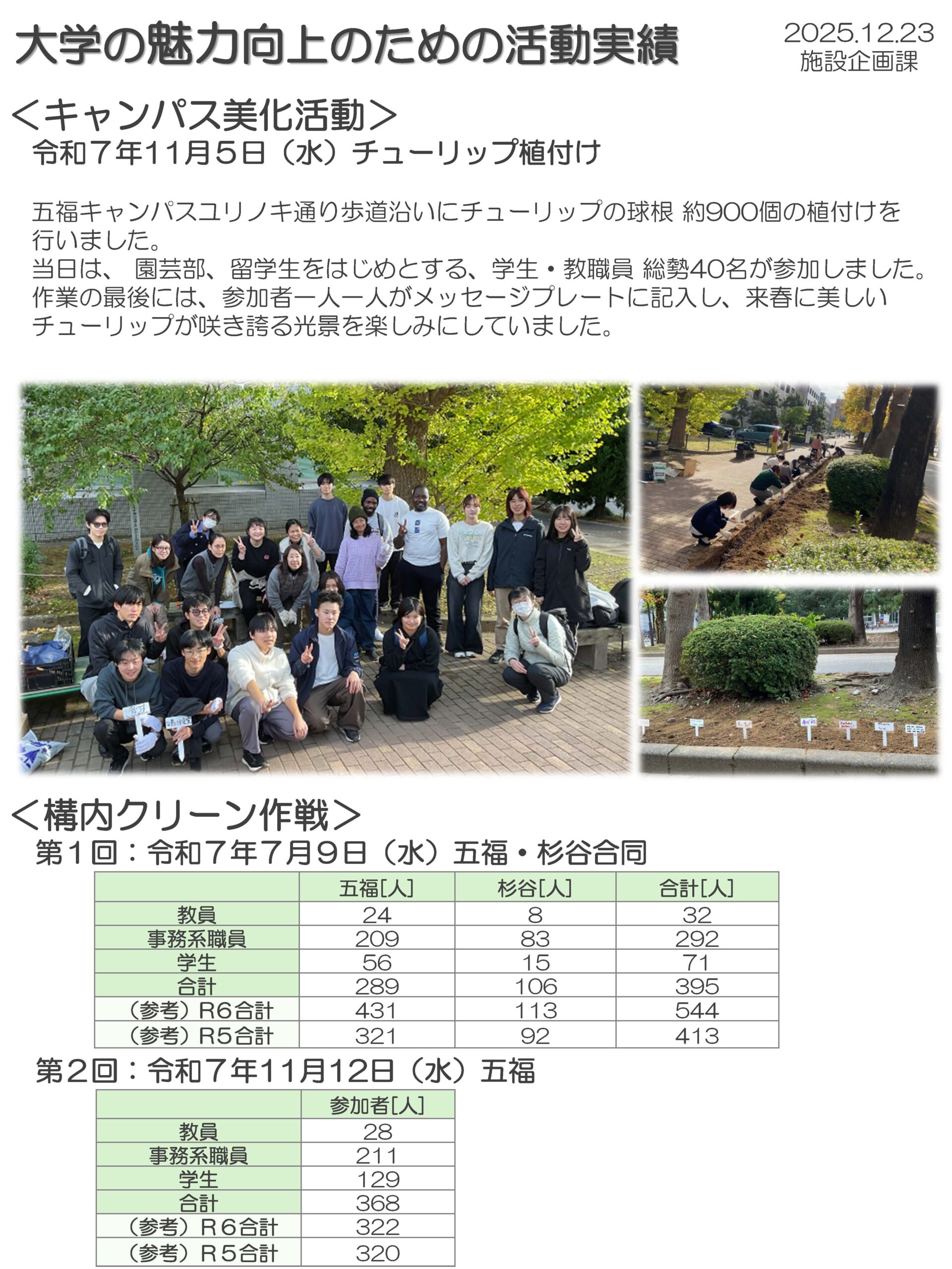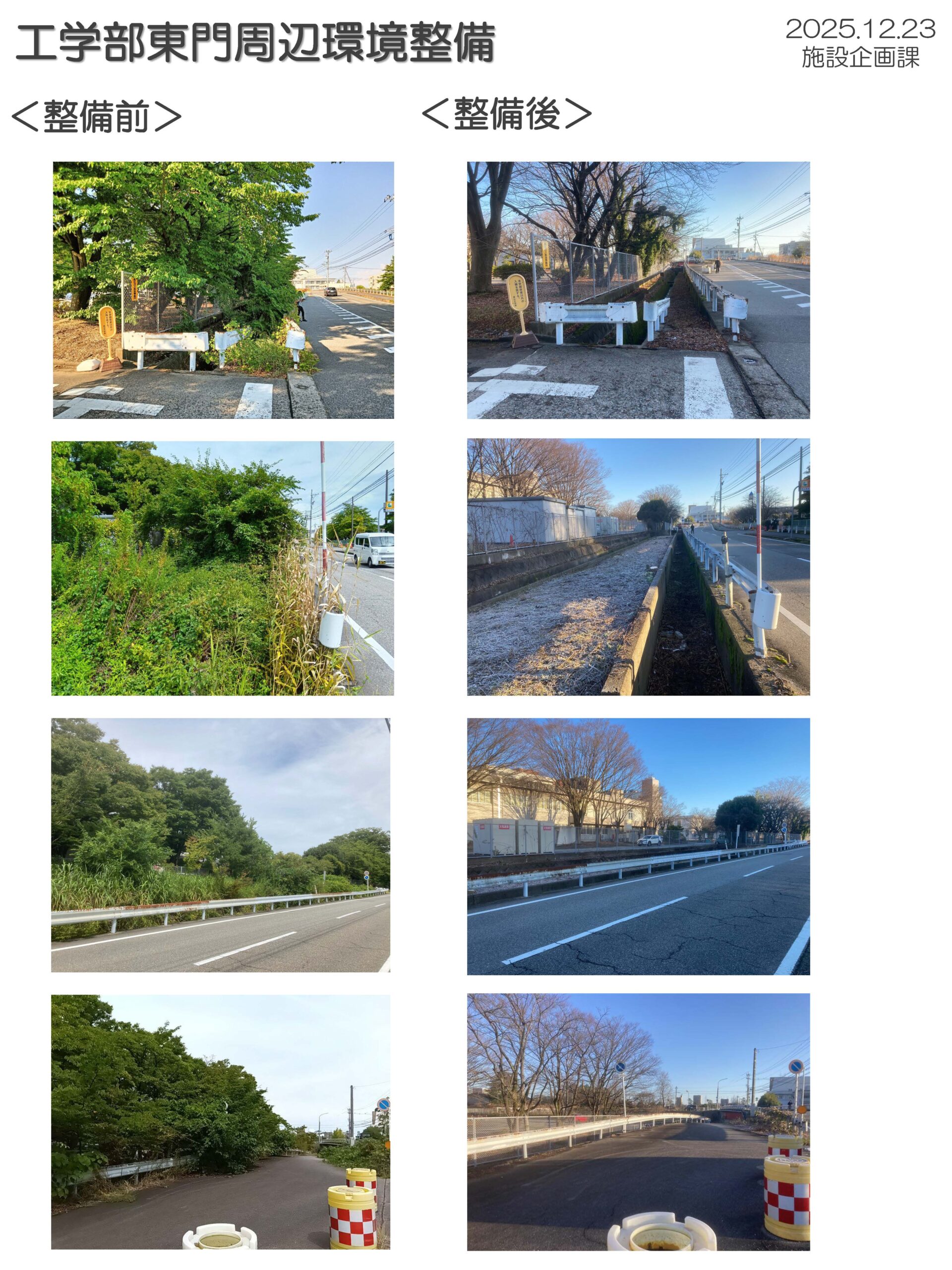 その際、若手研究者からいただいた「工学部東門周辺の劣化が著しい」「大学の魅力向上のため清潔で美しいキャンパス整備が重要ではないか」というご意見について、それぞれ「工学部東門周辺環境整備」と「大学の魅力向上のための活動」として対応しましたので、ご紹介します。