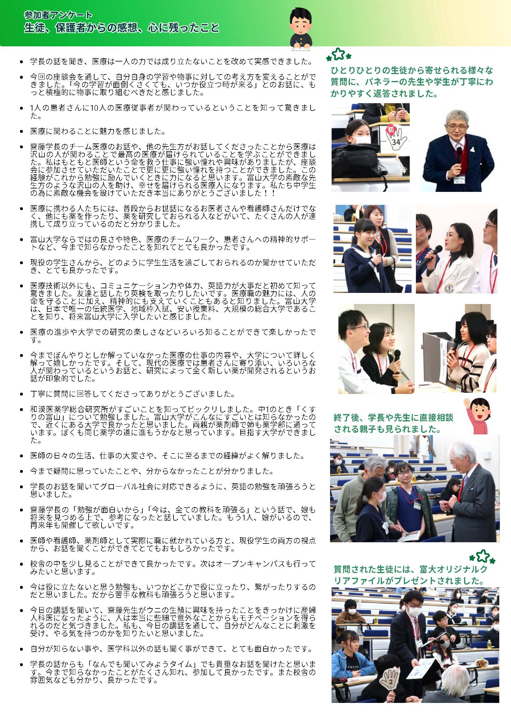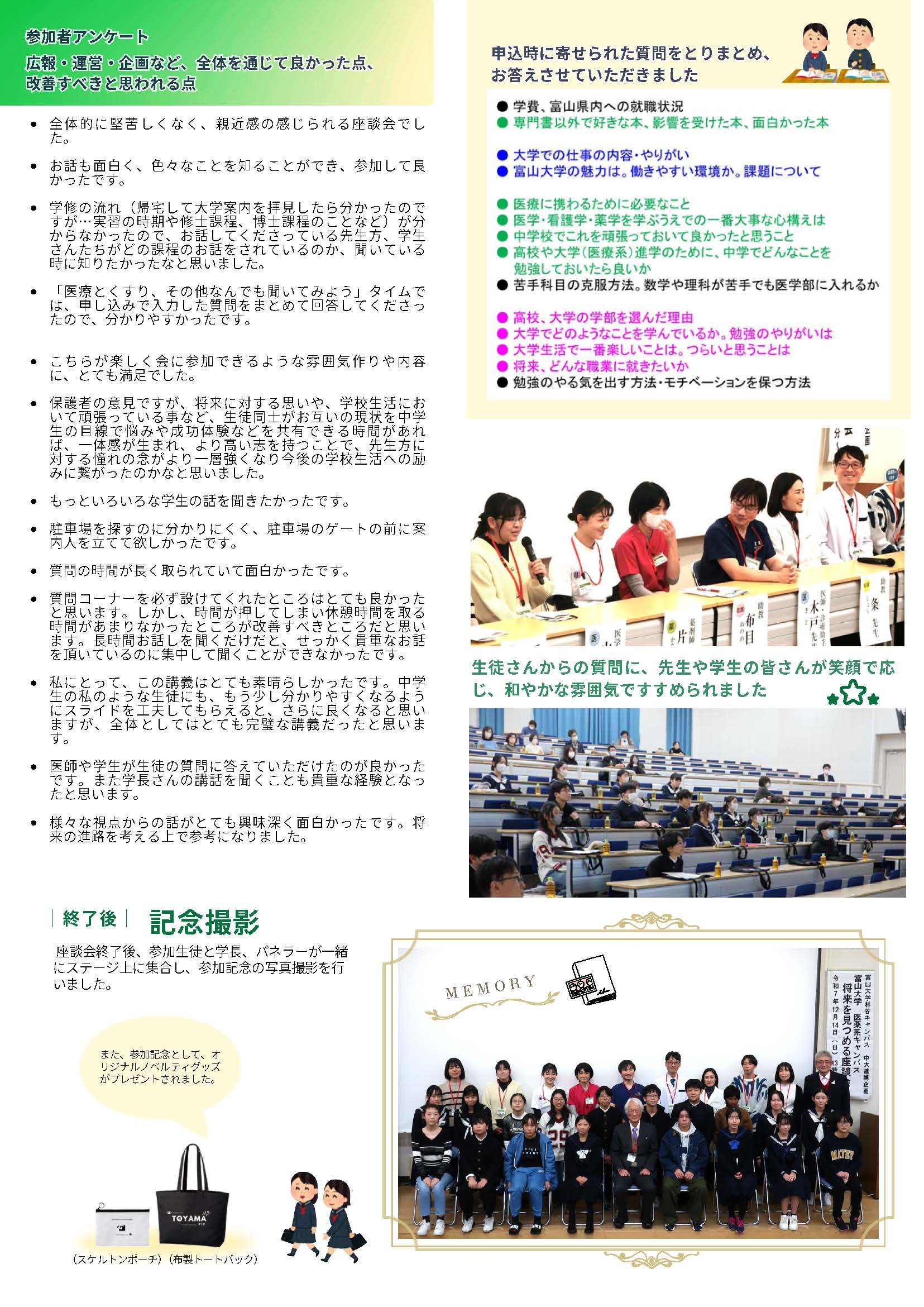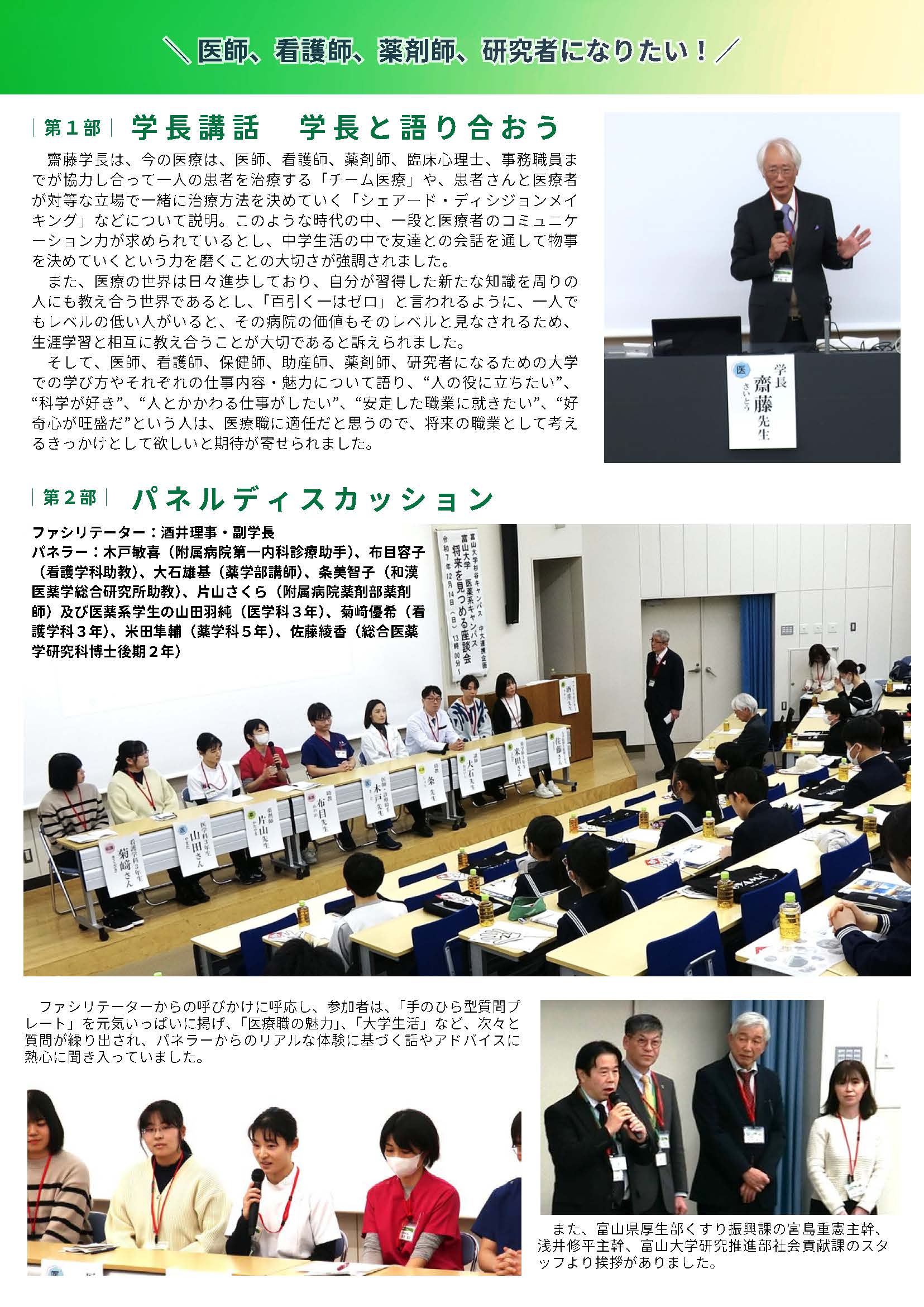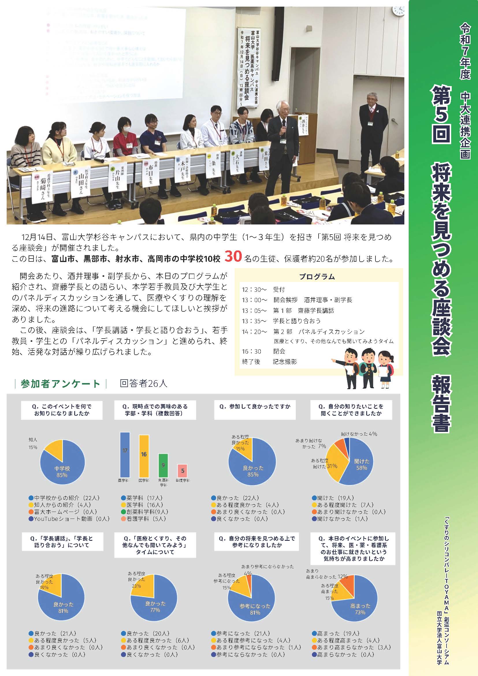 2025年12月14日(日)、本学と「くすりのシリコンバレーTOYAMA」創造コンソーシアムの共催で、「第5回 将来を見つめる座談会」が県内の中学生30名及び保護者約20名を招き、富山大学杉谷キャンパスで開催されました。