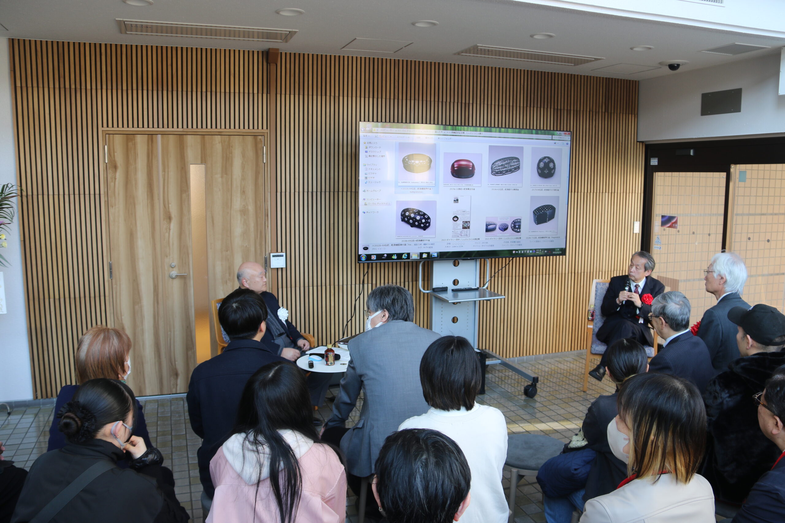 オープニングセレモニーでは、林特別栄誉教授と工芸史家 寺尾 健一氏との対談が行われ、作品の作成意図や秘話について対談されました。引き続き、ギャラリー「キューブ」において、林曉特別栄誉教授、小川太郎講師、新谷仁美特命助教の漆芸作品の見学を行い、高度な技法と表現の奥深さに触れ、日本の伝統工芸の価値を改めて感じる機会となりました。