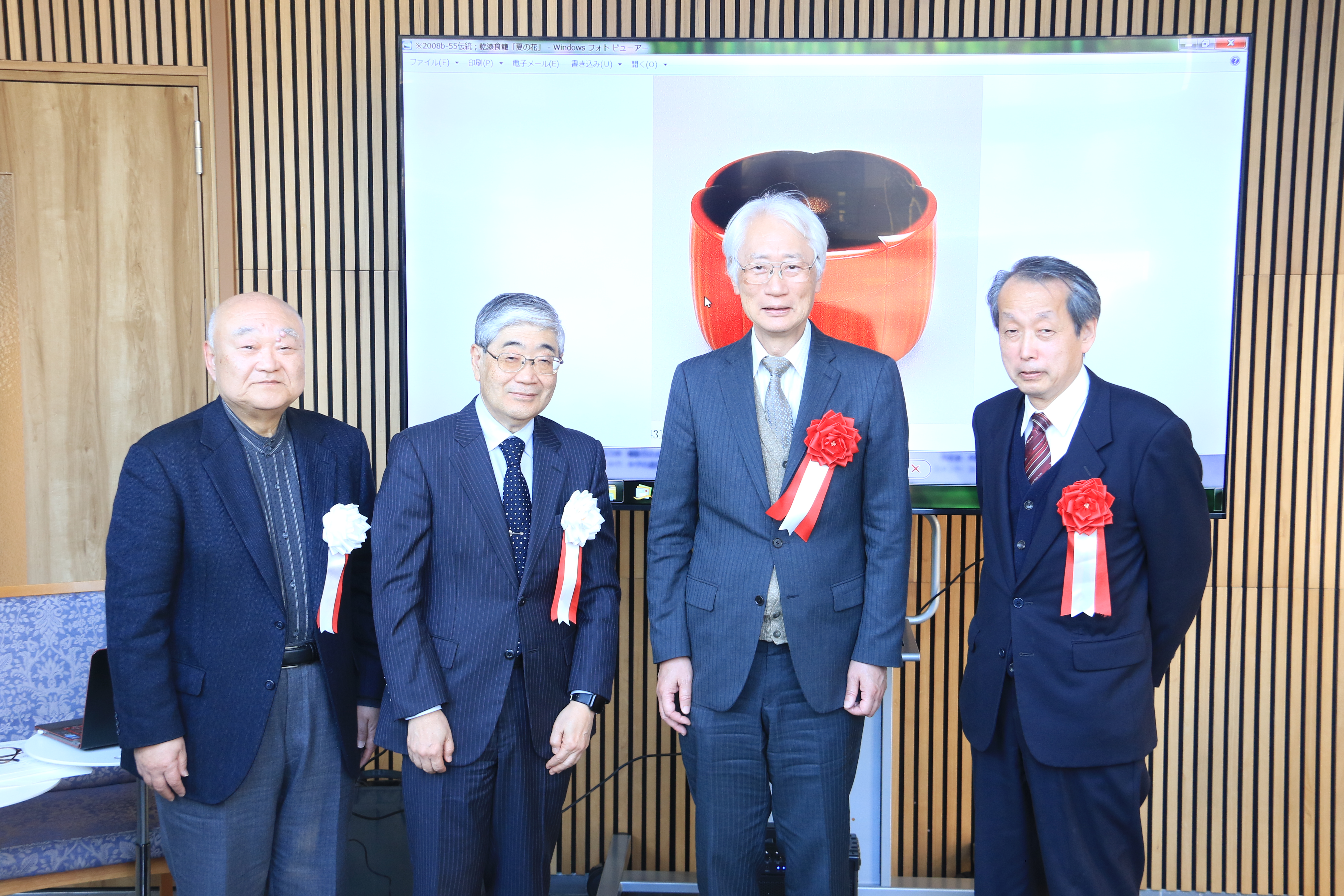 集合写真(左から寺尾氏、北島理事、齋藤学長、林特別栄誉教授)