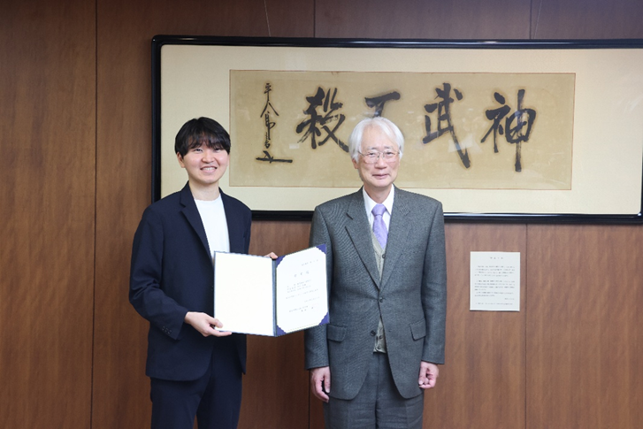 称号記授与式では,齋藤学長から「本日の授与を契機に開発したシステムを多くの会社に活用していただき、それが御社の利益に還元されることを期待しています。」と挨拶があり,株式会社GENLY 中村 代表取締役に称号記が授与されました。その後,中村 代表取締役から事業化に対する抱負が述べられました。