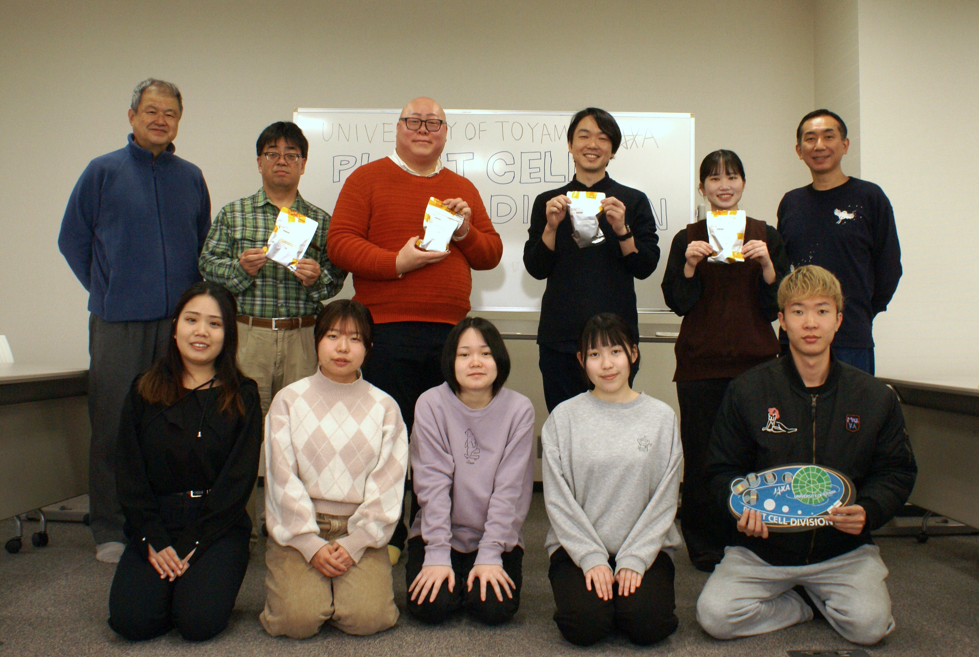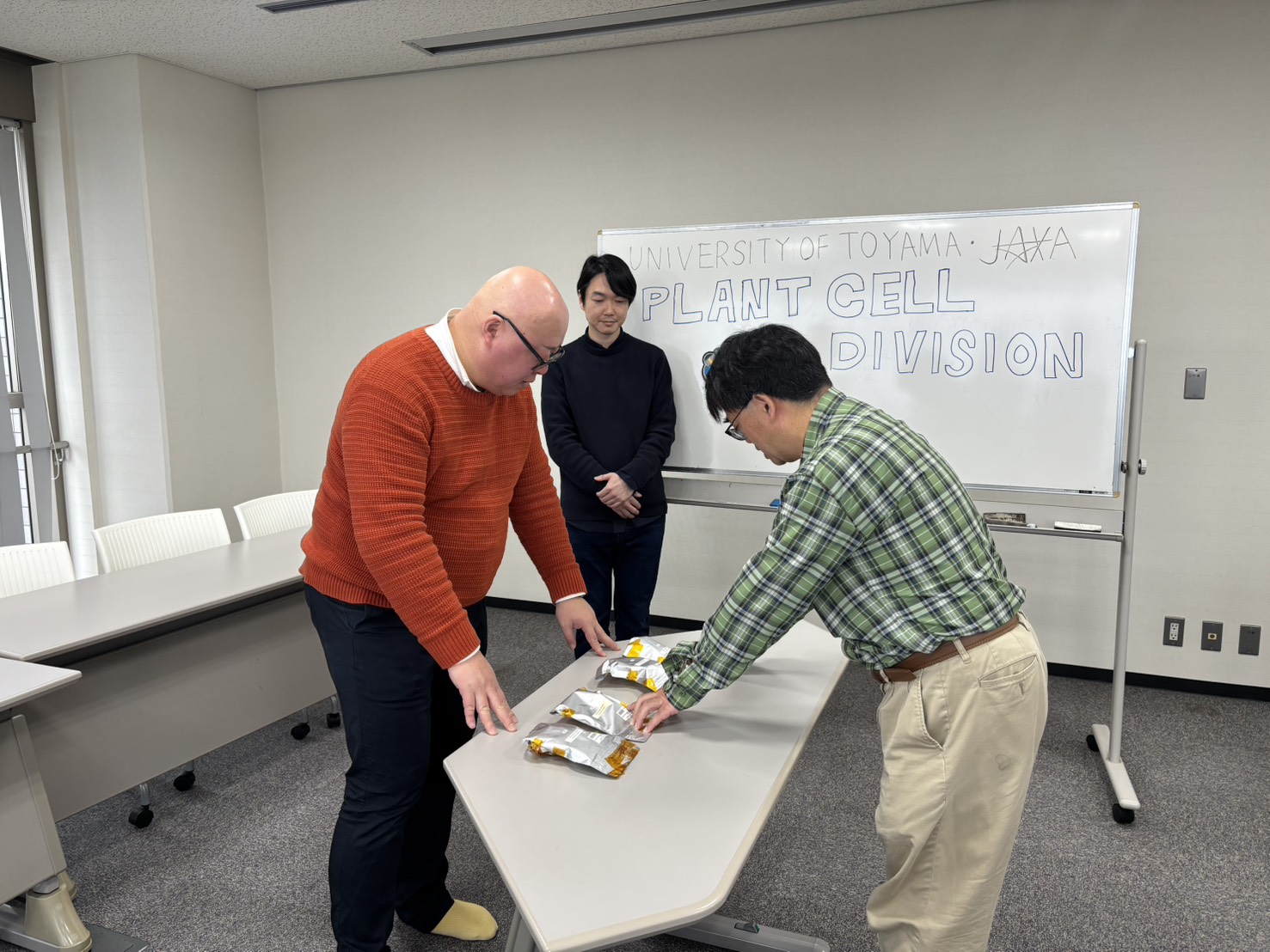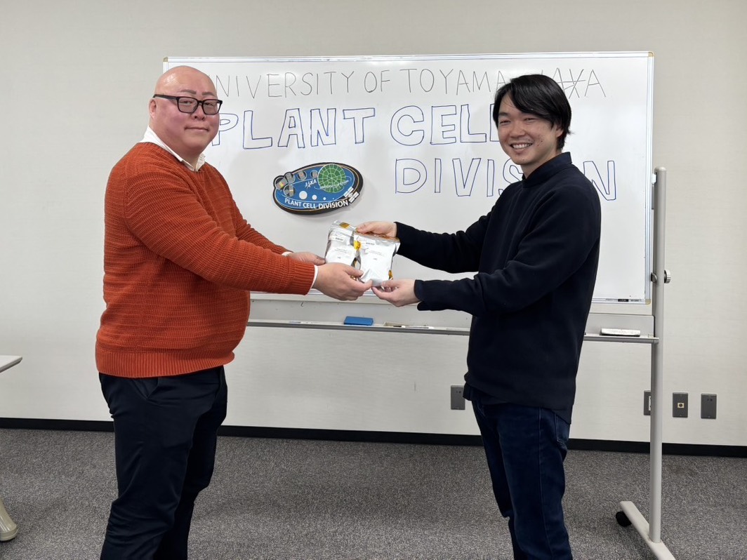 第1回目の宇宙実験のサンプルは、昨年8月にSpaceX 33でISSへ打ち上げられ、9月に宇宙実験は実施されました。その貴重なタバコ培養細胞と藻(コレオケーテ)のサンプルは、今年の2月27日に地球に帰還し、NASAを経由して、3月19日に富山大学五福キャンパスにて、JAXA職員から玉置講師と玉置研究室の学生さんたちに引き渡されました。