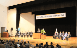 富山大学黒田講堂にて、統合20周年記念式典及び記念シンポジウムが開催され、関係機関、卒業生、在学生、教職員約300名が本学20周年の節目を祝いました。